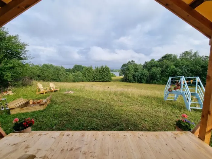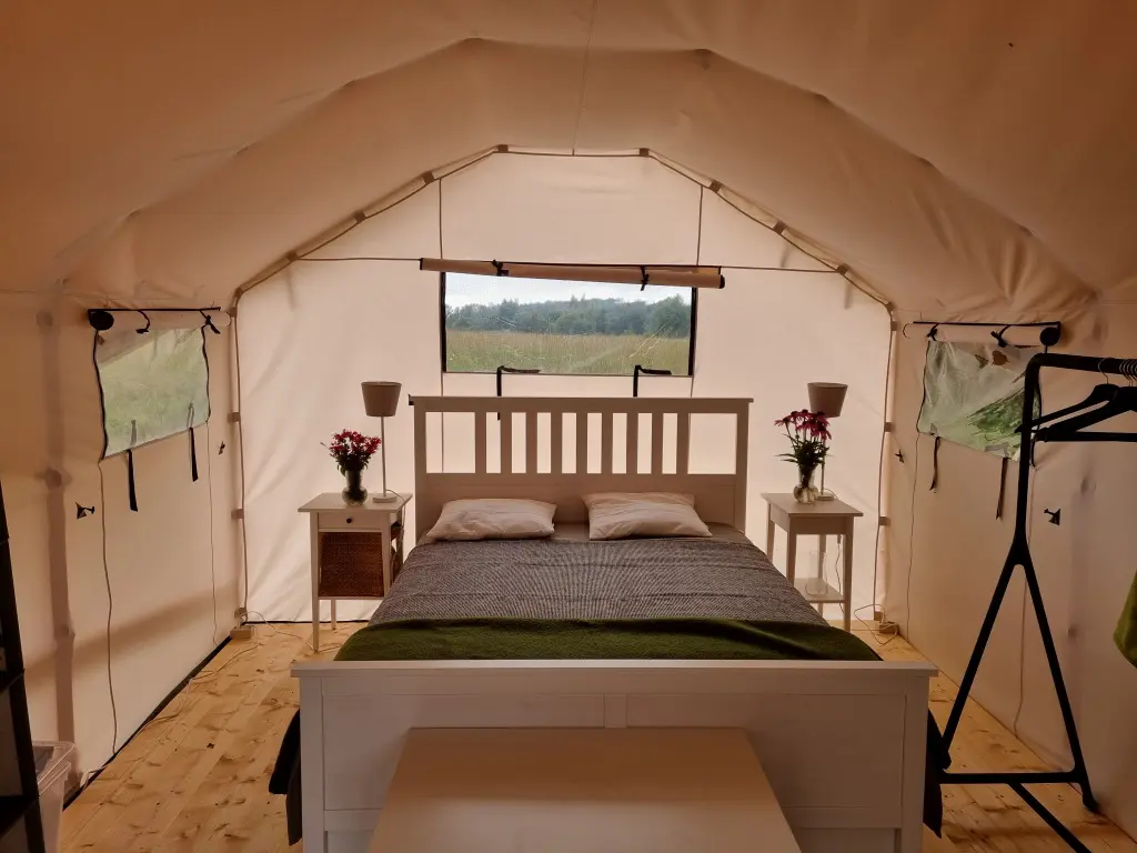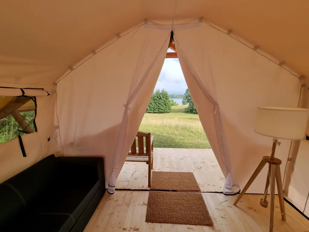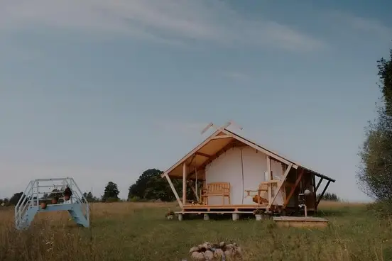 Viesiem ir iespēja palikt arī labiekārtotā glempinga teltī, kas atrodas meža malā, pļavas ieskauta, ar skaistu skatu uz Daugavu – vietā, kur var piedzīvot dabas tuvumu un rīta mieru.